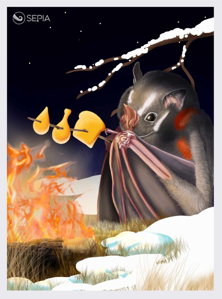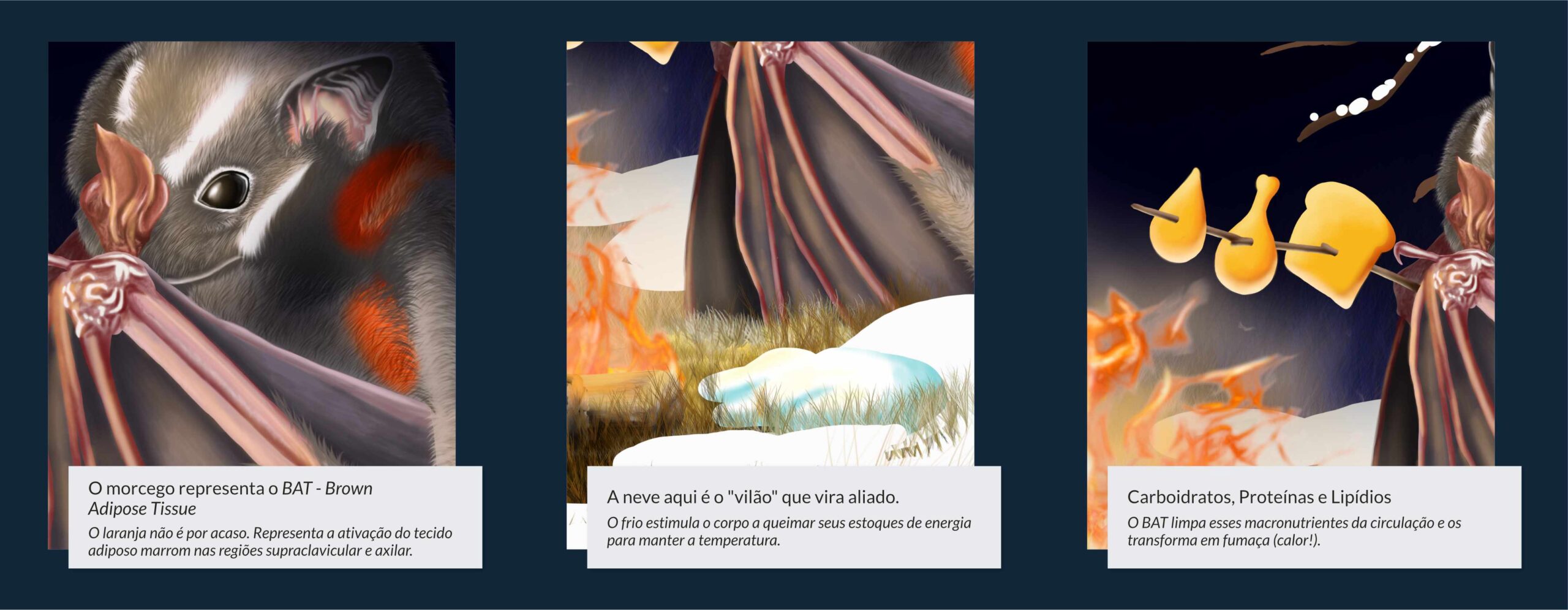 A ilustração personifica o tecido termogênico através de um morcego (bat, em inglês), utilizando uma narrativa visual para explicar a fisiologia do gasto energético: