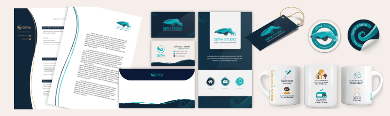 Criação de materiais como papel timbrado, envelopes, assinaturas de e-mail e cartões de visita (impresso ou digital).